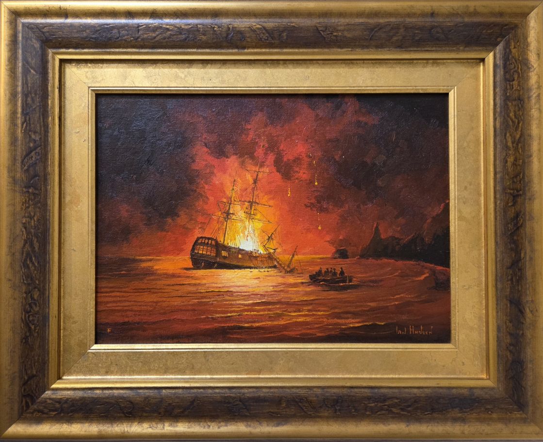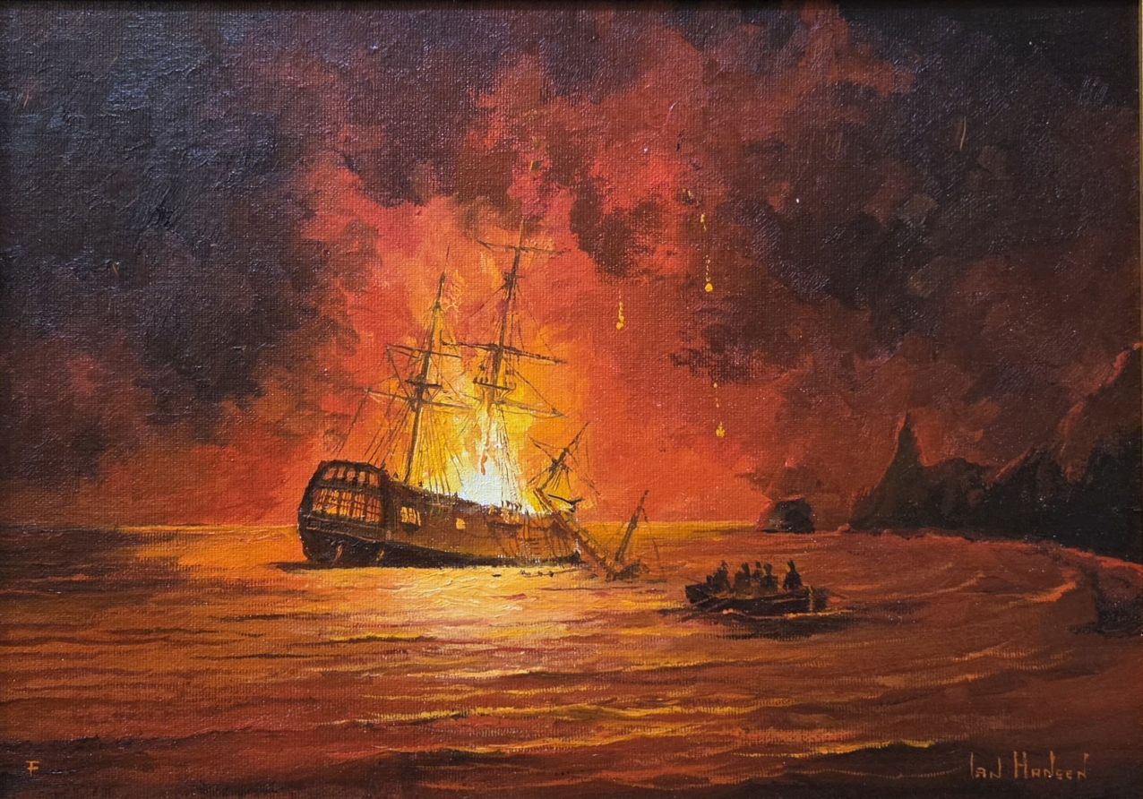 Bounty Burning (Pitcairn Island 1790) Original Oil on Canvas Board 36cm x 26cm