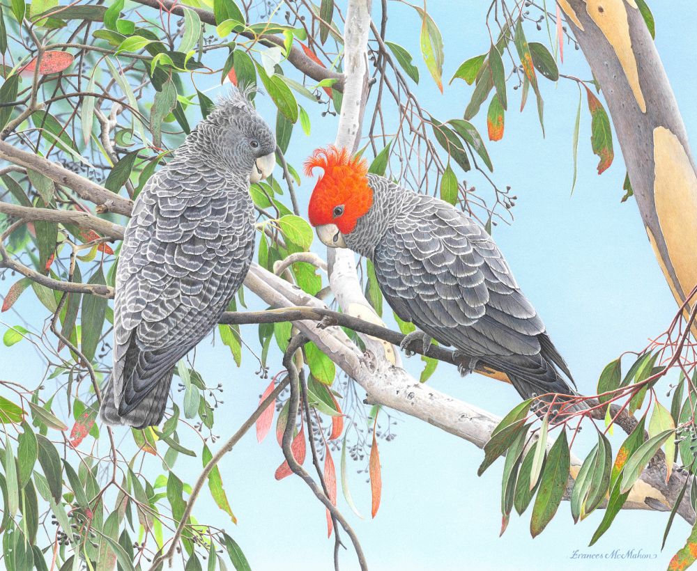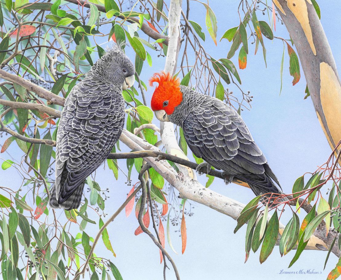 Frances’s Inspiration: “I’ve had many requests to paint these incredibly popular birds. It was only by sheer luck that I saw a female bird alight on a gum tree about 30 metres away! The resulting photos were a little grainy, but with careful research I managed to fill in the missing details. Wishing to depict both a male and female, one of the photos was altered to create a male. That brilliant red head deserves to be the focal point!