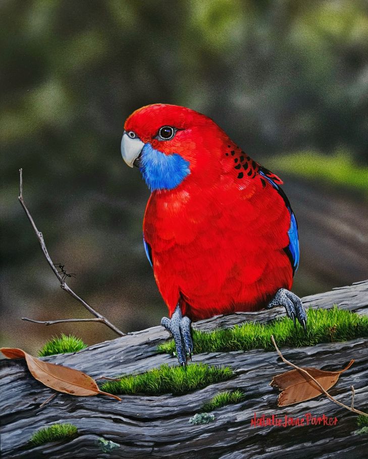 Natalie’s Inspiration: “A few years ago I travelled to Tasmania with my family, I had an amazing time, and found it to be so inspirational. I’m longing to go back there, but in the meantime the next best thing to do is revisit through my art. The moss and lichen in Tassie are on a different level compared with what I have around home. The pristine air and cool winters must give them an added boost! I also encountered Crimson Rosellas on multiple occasions, their rich feather colouring accompanied by their sweet little chirp made them easy to find. I so enjoyed reminiscing Tassie through this painting and it surprised me how it flowed as I created “Forest Fondness “.
