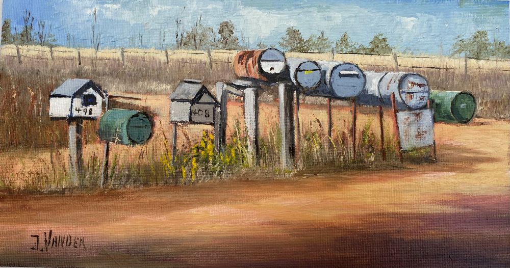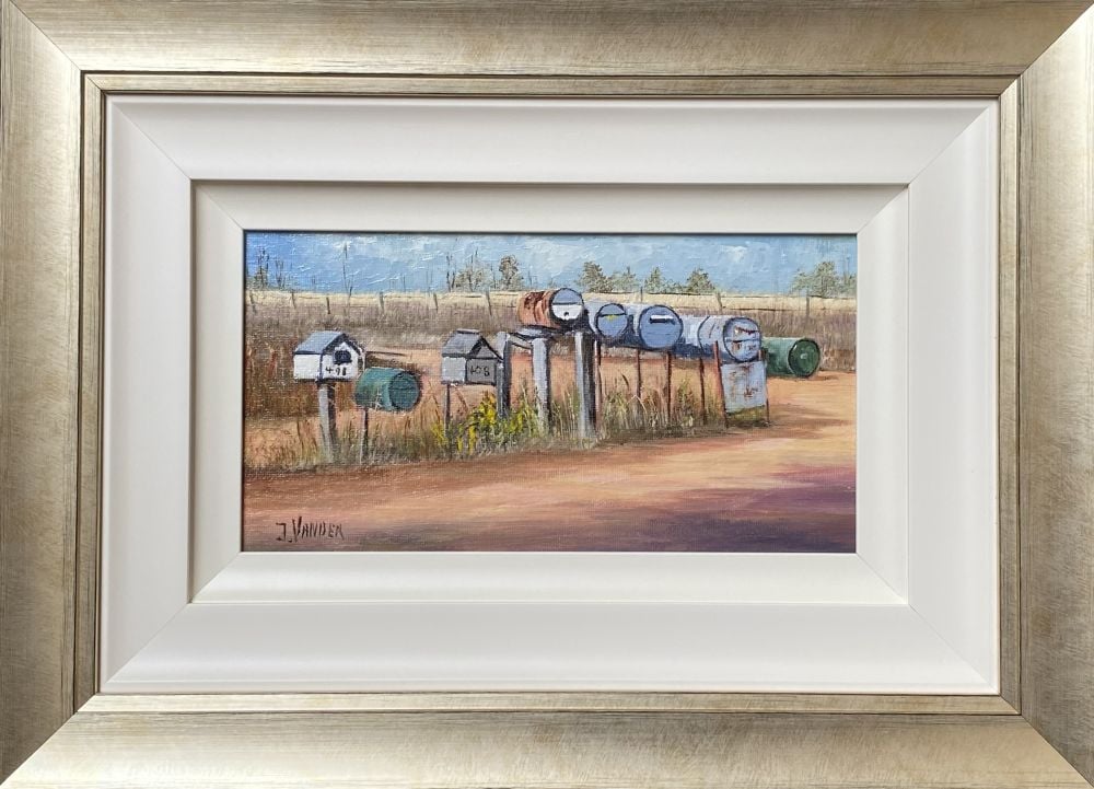 John’s Inspiration: “On one of my trips to rural Australia for painting subjects I came across some old but interesting letter boxes all in a row. Australia Post were trying to standardize the letter boxes, which had been strongly opposed and for the time being left alone. As a bit of a historian as well as an artist I decided to capture their individuality for prosperity. This row of letter boxes found near Goulburn are typical of rural Australia and were just waiting for me to paint them….”