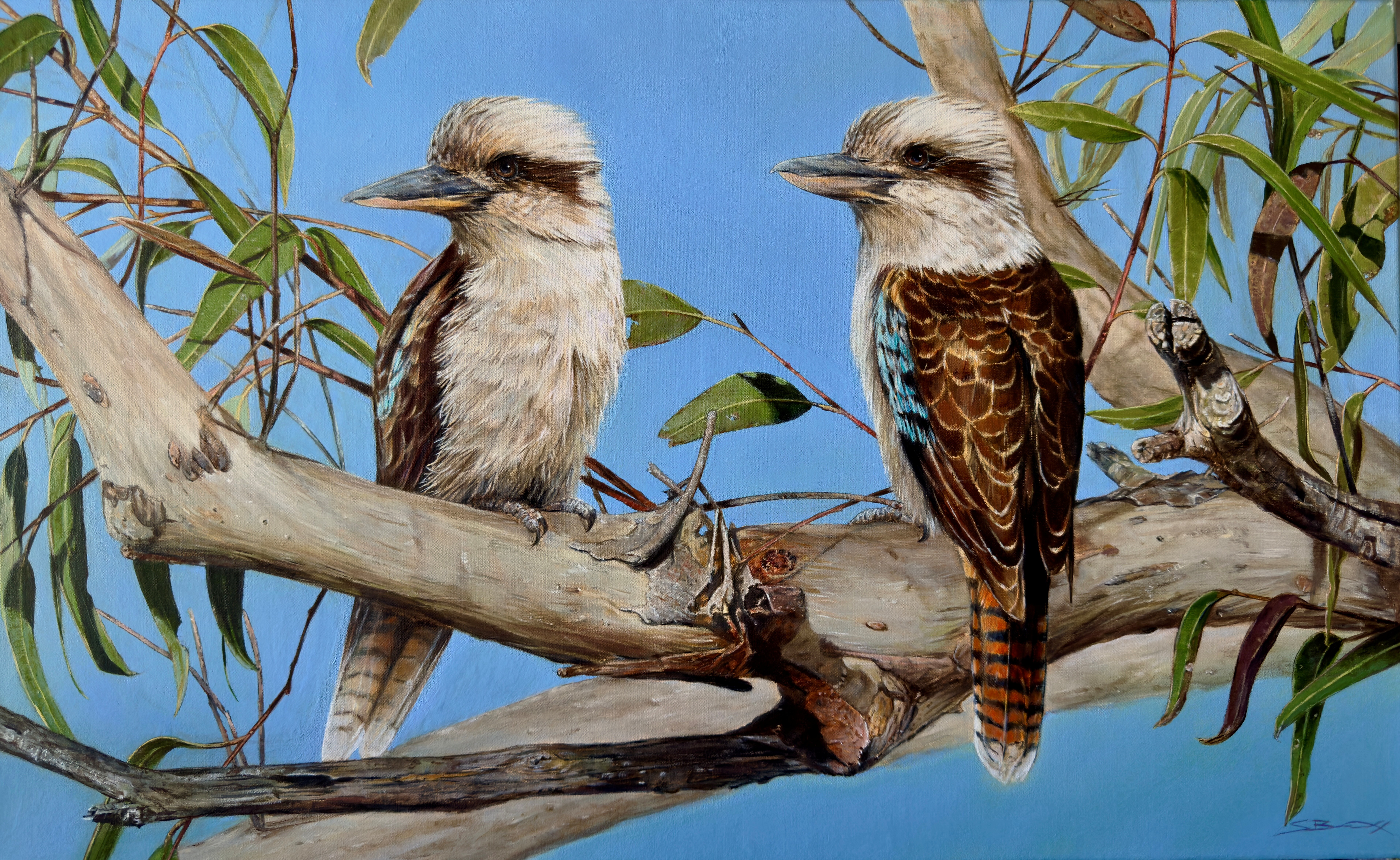 Known as “perch and pounce” predators, with this painting I wanted to see a pair of kookaburras taking in the familiar surroundings while perched among the canopy of a gum tree. Out of site and almost motionless on the high branches, with a small movement in the grass down below. With an attentive look they are both quick to turn to see what it is that maybe moving in the distance.