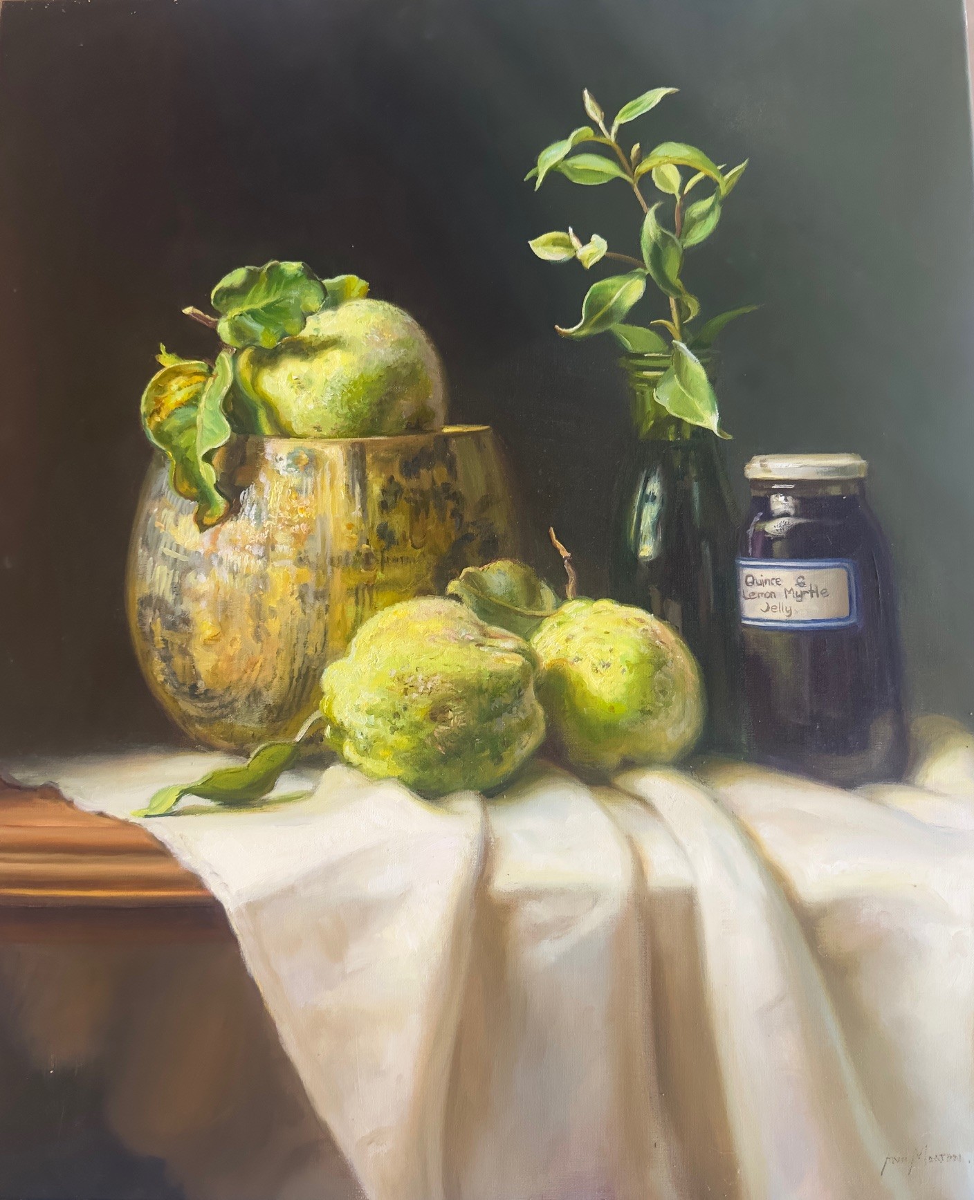 Ann’s Inspiration: “These quinces grow just outside my studio door. I watch each year for them to reach just the right stage to paint.  Turning from green to gold and covered in delicate fuzz. Of cause I’m not looking for perfection, the spots and bumps of the homegrown fruit give real character to the composition. They are not just for painting. As you see in the jar they make the best quince jelly, teamed with the Lemon Myrtle that also grows in my garden.”