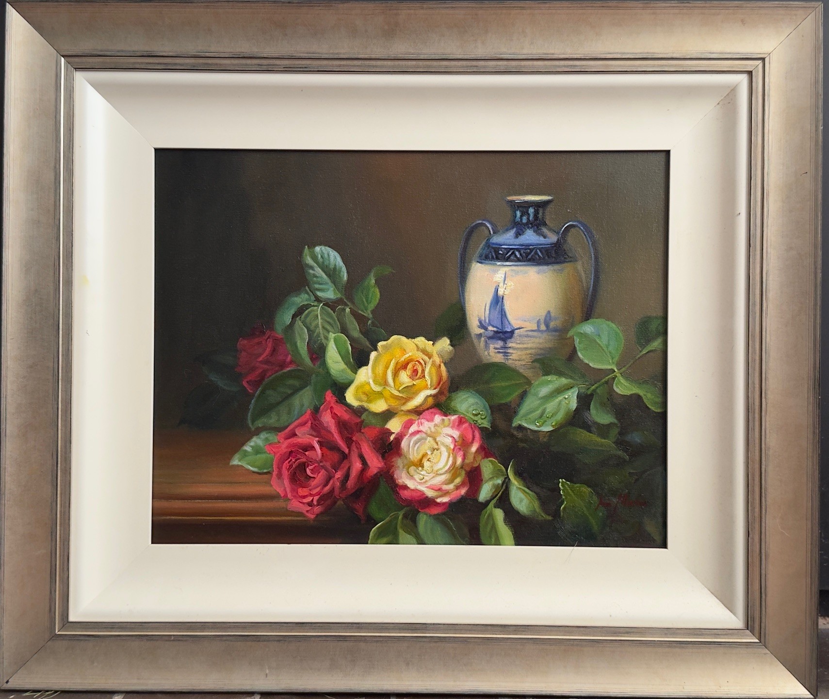 “Roses and Royal Derby” Original Oil on Linen 46cm x 35.5cm by ARC Living Artist Ann Morton
