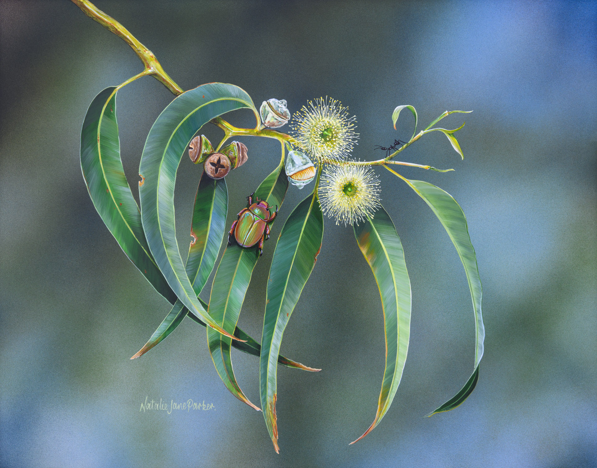 Natalie’s Inspiration: “Aussie gum leaves are a favourite foliage to accompany wildlife in my paintings, so to create a painting that features just the Eucalyptus leaves itself was very enjoyable to work on. I decided on a very simple and clean design for this painting. I chose a Christmas Beetle in addition to the gum as its similar colour tones would not distract the viewer from focusing on the delicate details of the blossoms.