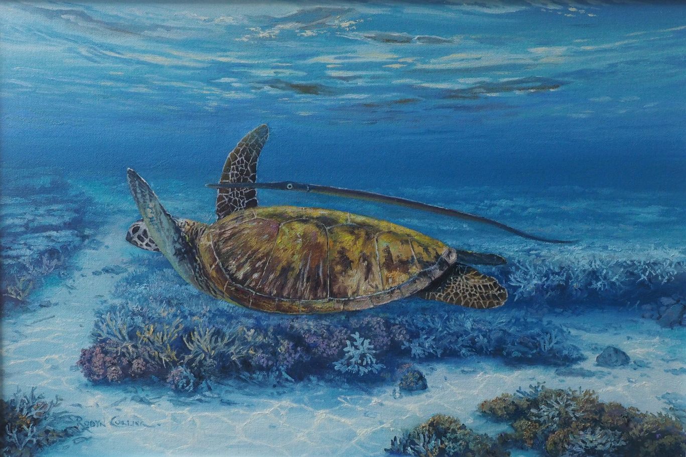 Robyn’s inspiration: “I loved painting this rare sight in the natural world as it tells an amazing story of a symbiotic relationship we don’t often see or know about. It is a documented natural phenomenon to see Longtom fish (also known as needlefish or houndfish) swimming with and interacting with sea turtles in the wild.”