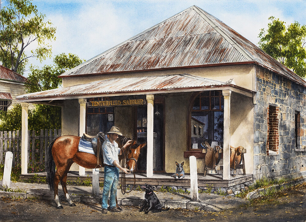 Tenterfield Saddler” is a painting inspired by the song written by Peter Allen as a tribute to his much-loved grandfather, George Woolnough. Since 1860, the distinctive blue-granite building on the High Street has primarily been a saddlery, but in other times a private residence, a bank and presently a museum celebrating George Woolnough and his time as the Tenterfield Saddler. Visitors have always been welcomed there and one famous customer was Banjo Patterson.