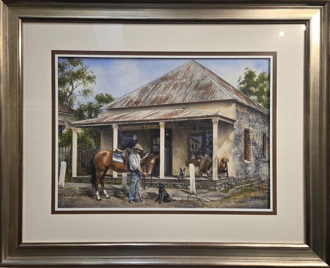“Tenterfield Saddler” is a painting inspired by the song written by Peter Allen as a tribute to his much-loved grandfather, George Woolnough. Since 1860, the distinctive blue-granite building on the High Street has primarily been a saddlery, but in other times a private residence, a bank and presently a museum celebrating George Woolnough and his time as the Tenterfield Saddler. Visitors have always been welcomed there and one famous customer was Banjo Patterson.