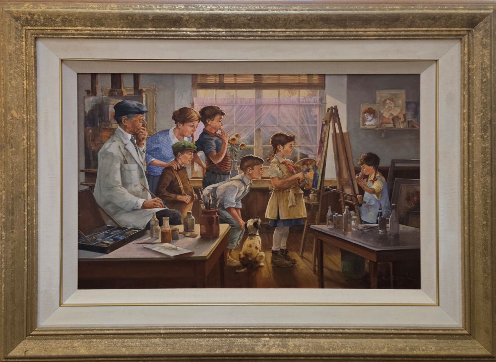 Doyle’s meticulous realism and storytelling skill transforms an everyday moment into a celebration of learning, creativity, and shared experience. The work speaks not only to the act of painting itself, but to the communal joy of watching talent emerge-making it a heartfelt homage to art, mentorship, and childhood curiosity.