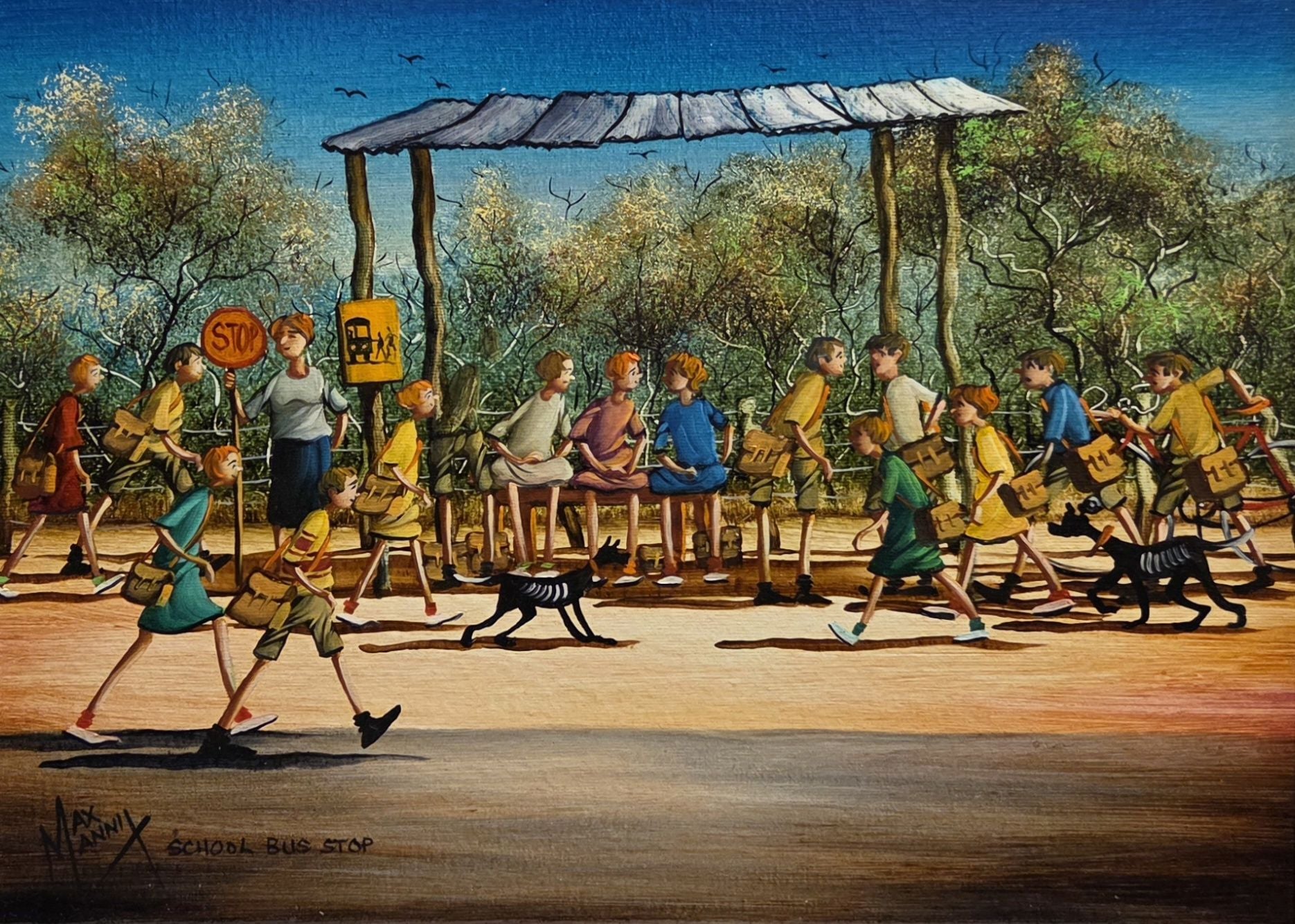 School Bus Stop Original Oil on Board 38cm x 30cm