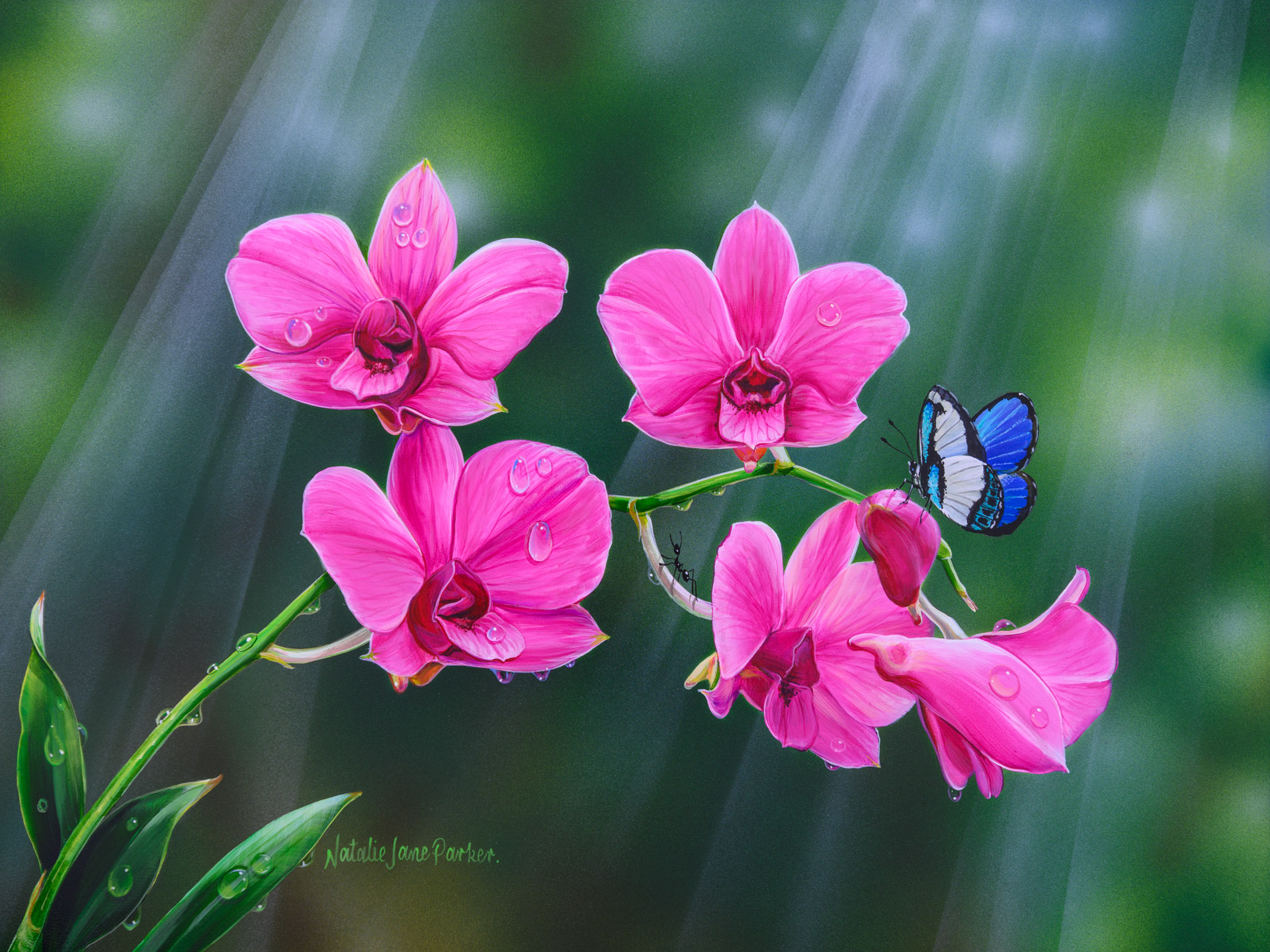 Natalie’s Inspiration: “I have always been attracted to tropical forests around our country, I love little orchids with moss and lichens that cover the branches amongst the trees. I love painting in the endless green colour tones when I add them to my artworks. Creating this piece featuring the striking pink blooms of a Cooktown Orchid was a lovely change.