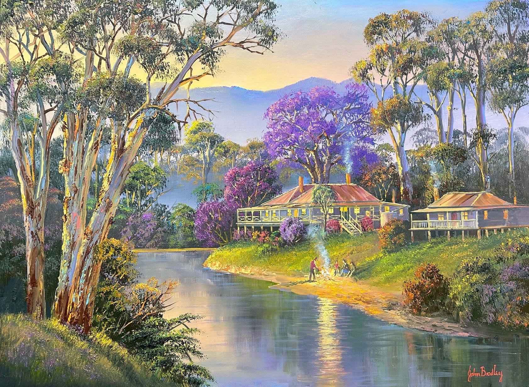 John has captured the fleeting change in nature’s tides, that magical moment when all sounds are hushed as day yields to the onset of night. The sun has set but a soft glow remains, illuminating the landscape. A small family group are gathered around the fire, possibly burning off some fallen timber or perhaps dad is preparing a camp oven meal to give mum a night off from cooking. The two homes are built in the classic Queenslander style with the smaller house most likely built first and the larger one some time later as the family grew. This was a common practice in many parts of Australia with the outgrown dwelling being used as a manager’s house or home to married children. The jacaranda in flower sets the scene in spring with its cool nights and warm days, generally time in rural areas for the traditional spring cleanup.