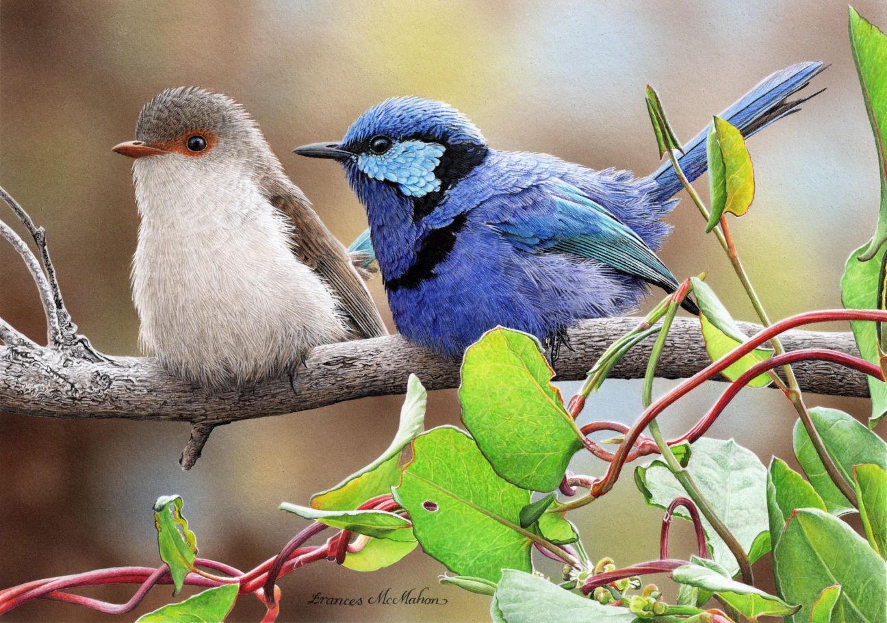 Frances’s Inspiration: “Having recently completed a commissioned painting of this species, I knew it wouldn’t be long before the urge to paint more of these extraordinary birds possessed me. During my guided bird photography tour to WA, I was amazed to see plenty of these fairy-wrens in suburban and bush environments. Indeed, I got the impression that many local residents almost take them for granted! I’ve deliberately added touches of yellow to the background, since it is the complementary of violet. The birds are painted larger than life size, as I want the viewer to more easily appreciate the mesmerising beauty of these birds, whom I believe rival the birds of paradise.