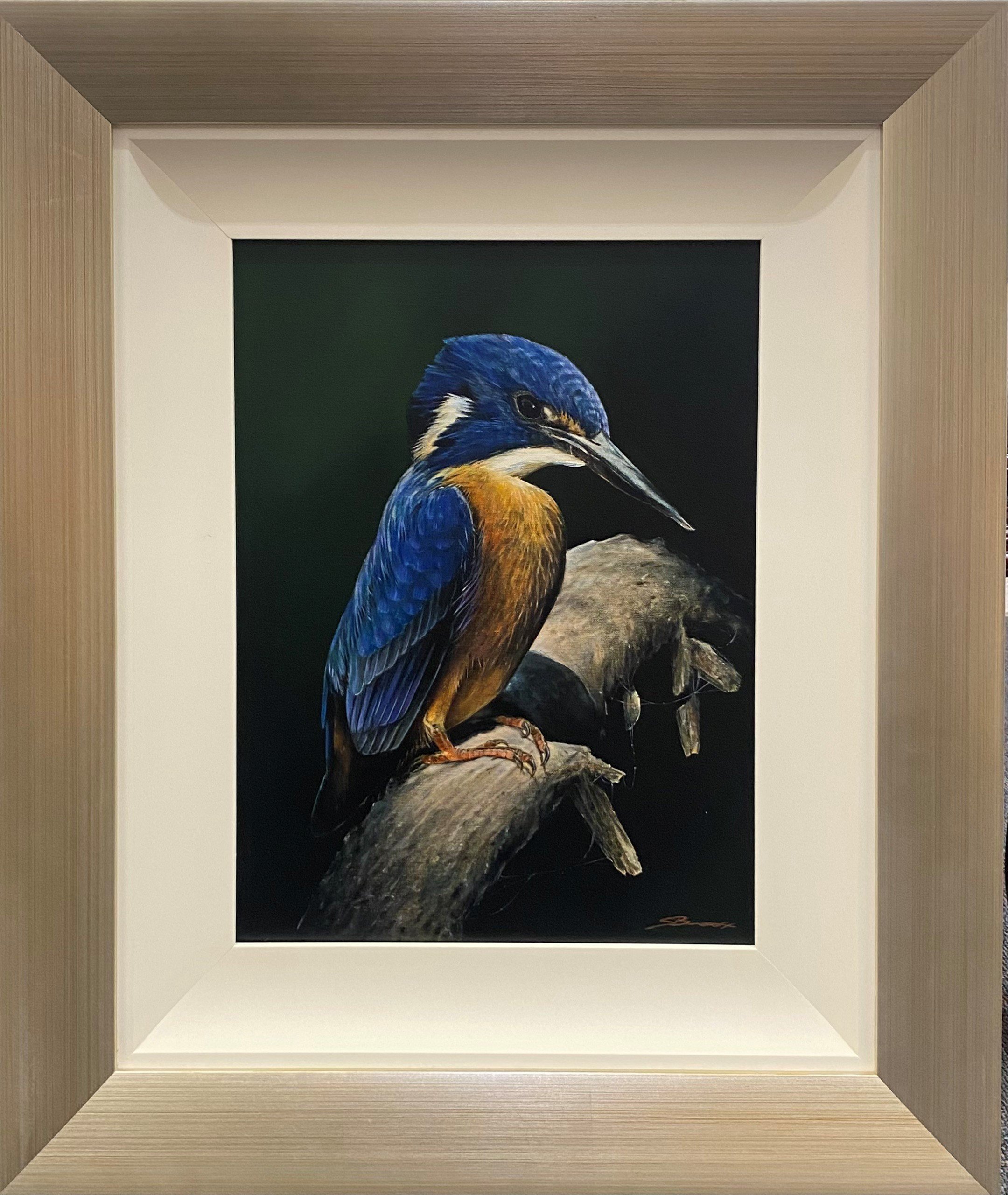 Stephen’s Inspiration: “The Azure Kingfisher seeks some shelter in the shade of some dense vegetation along the river bank. Patiently staying ever so still in a low-lying branch waiting for its next catch. The Kingfisher seeks a variety of food whether it be small fish, yabbies, water beetles, spiders, locusts, and small frogs or tadpoles. Being small in size It is often difficult to see until it quickly darts from a perch above water. The colours of the Azure are exactly as titled with a striking brilliant azure or deep blue plumage on its head, back, and upper parts, a bright orange-reddish breast and belly, a long, slender black bill, red legs with only two forward-facing toes, and white spots on the sides of its neck. These striking colours make the bird easily identifiable and that being my focus for this painting was to simplify the background and focus on capturing this beautiful distinct Azure Kingfisher in the moment. I was fortunate enough to see one of these beautiful birds at a quick stop along the Upper Daintree River near Port Douglas on our way to Cape Tribulation. This was very unexpected. Although what was a great moment for myself seeing the Kingfishers amazing colours in person it was short lived and it quickly flew off”.
