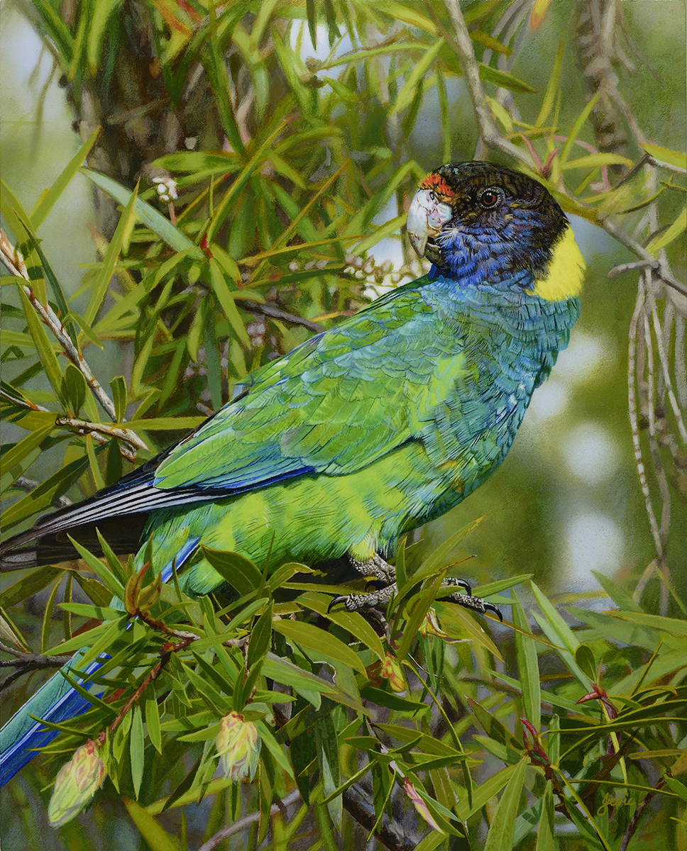 Who’s Looking (Port Lincoln Parrot) Original Acrylic on Baltic Birch 29cm x 36cm – SOLD